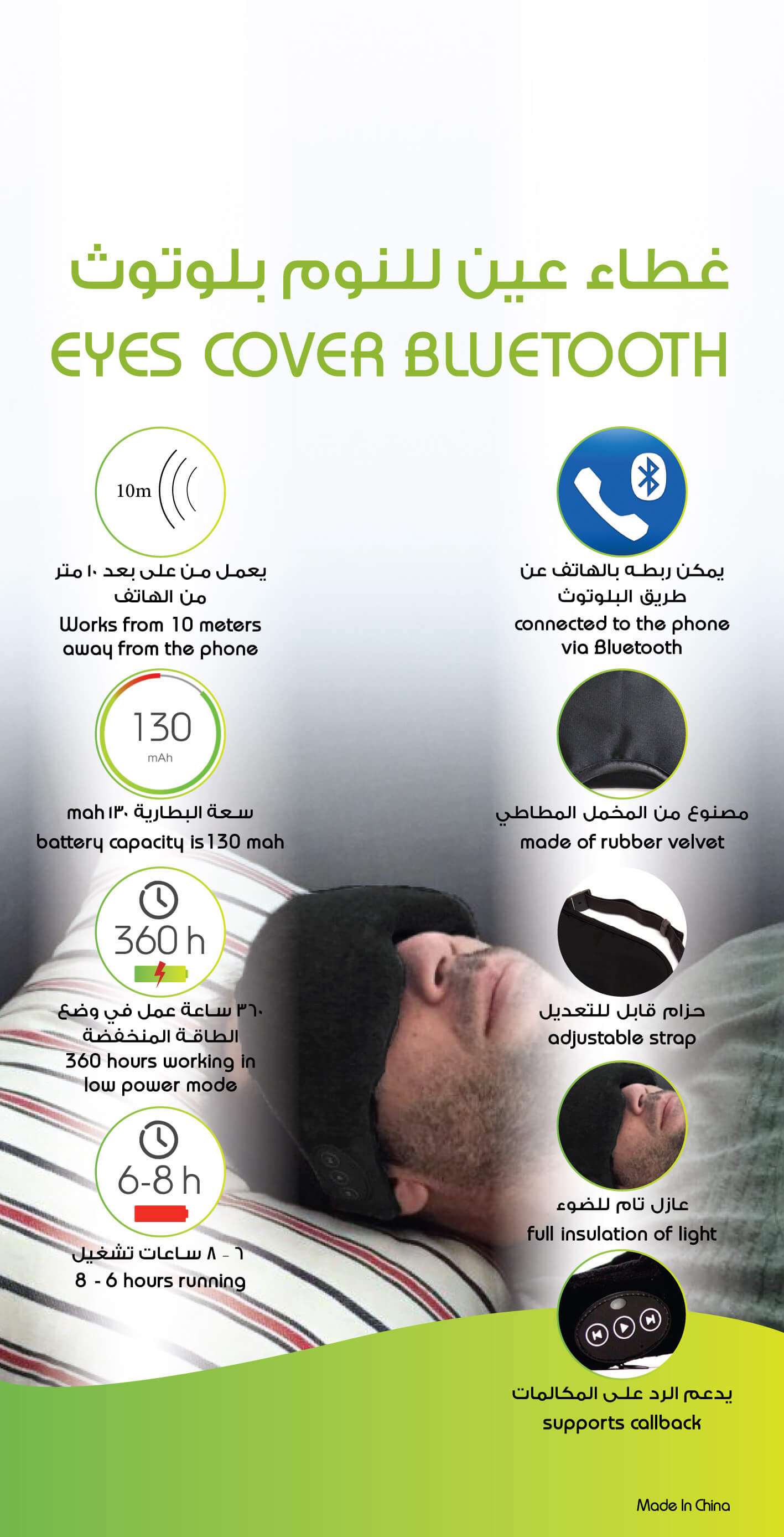 - غطاء عيون أسود مبطن بإسفنج من الداخل لحجب الإضاءة عن العين مع سماعات.